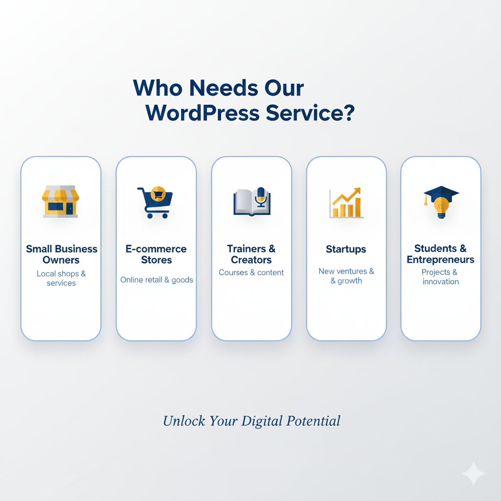 Our WordPress development service is tailored for a diverse range of clients. Whether you’re a small business owner, online store operator, trainer, startup founder, or entrepreneur, this service provides professional WordPress site creation and WP theme customization to boost your credibility, enhance user experience, and grow your online presence efficiently.
