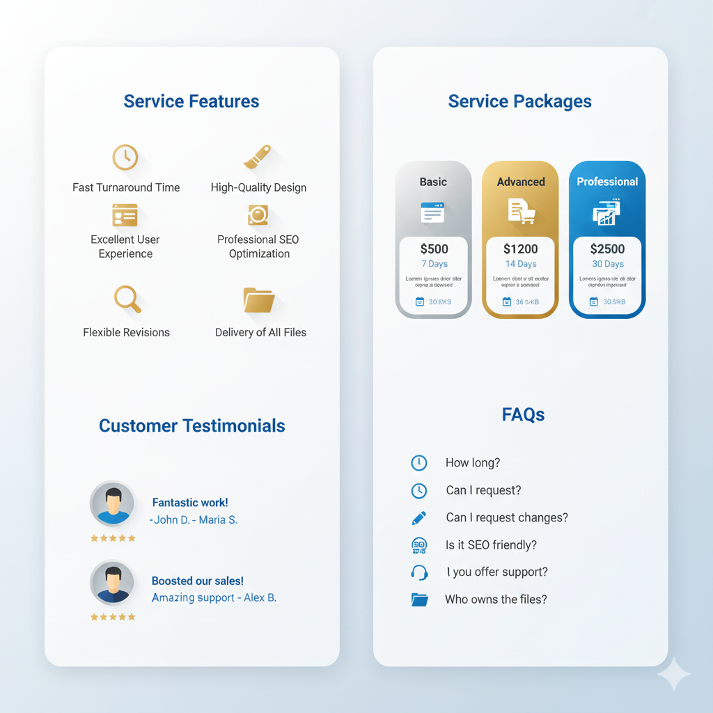 | Professional Package | All Features + Unlimited Revisions + Source File Delivery | $500 | 10 Days |
